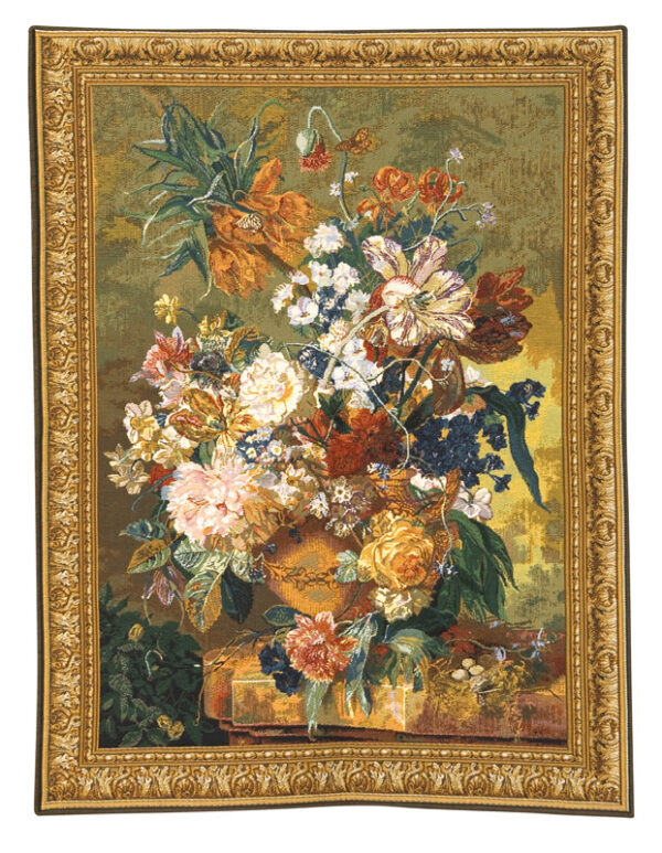 This tapestry represents a floral painting of Jan van Huysum (1682-1749) designed specially for the Duke of Mecklenburg, circa 1740. The artist was born in Amsterdam and was known as one of the most prominent Dutch flower painters.